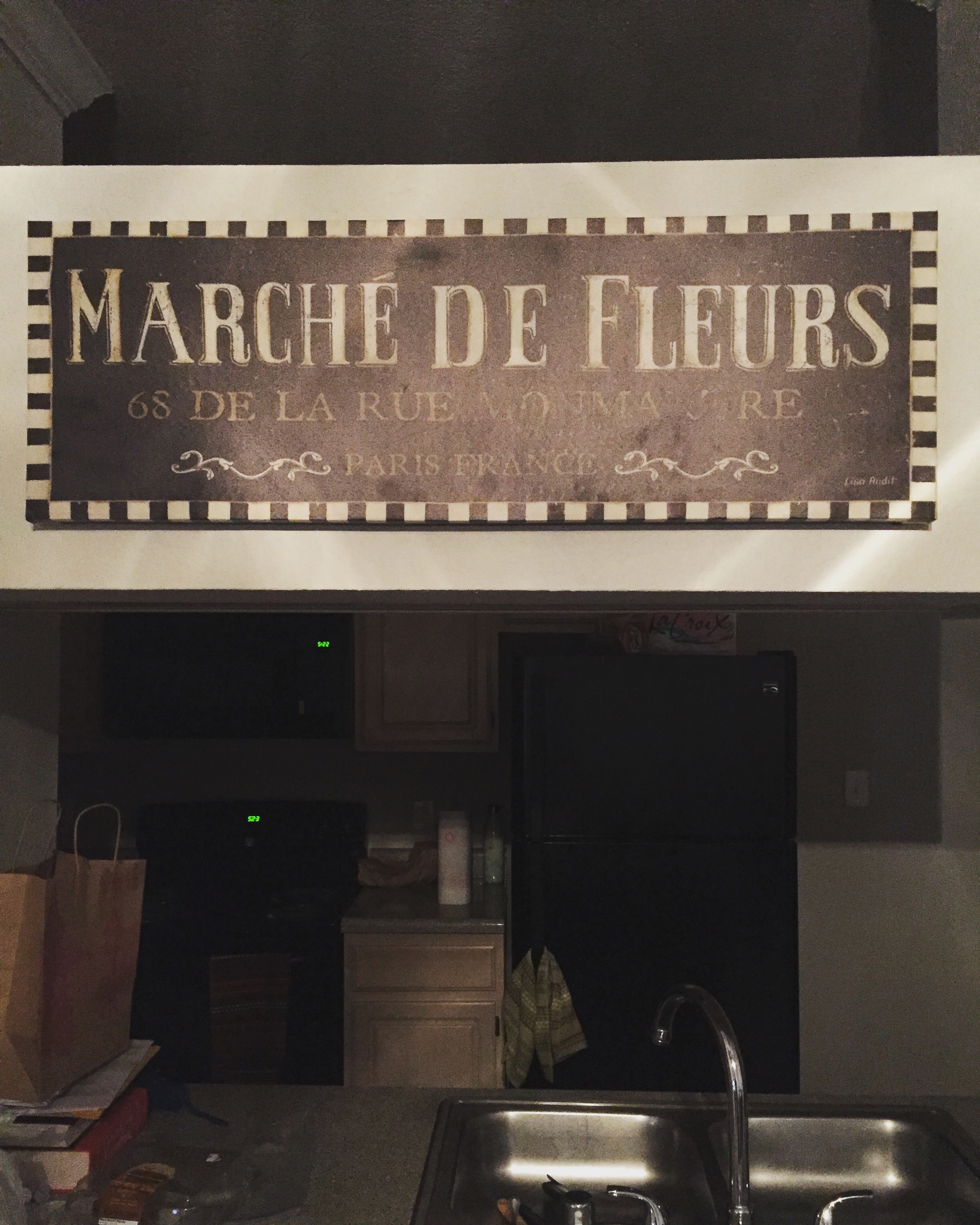 I hung up new artwork for l’appartement. This lovely French sign means flower market. It’s not particularly centered, but just take comfort that my use of a hammer (!!!!) didn’t result in the loss of my sweet fingers.